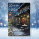 Nostalgisch Vintag aussehen Weihnachten "Deck the Halls" Feriendorf-Szene mit einem Restaurant-Fenster mit Kiefernwüsten, das ein Licht in das Fenster zeigt. Einige Tische stehen im Freien und einer davon ist mit einer niedlichen Schneeglobe überzogen. Die Straßenbeleuchtung ist eingeschaltet, und die Lichter in den Geschäften werden in Erwartung des Abends beleuchtet. Ein Weihnachtsbaum ist schneebedeckt mit Bauern und Geschenken unten. Fügen Sie Ihren einzigartigen Urlaubsgruß, das Jahr und den Familiennamen oder Namen Ihrer Wahl zu einem einzigartigen Sake hinzu, der für die ganze Familie Spaß machen kann.
