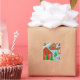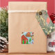 Dies ist ein niedliches Design des Weihnachtsmanns, der am Weihnachtsabend ein schneebedecktes Dorf besucht. Helle Farben und Weihnachtsdekorationen. Ein großartiges Siegel für Geschenke und Karten in dieser Urlaubssaison. Grüntöne und Rot sind die Hauptfarben.