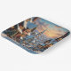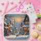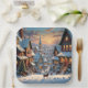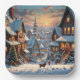 Ein malerisches Winterdorf ist mit schneebedeckten Dächern geschmückt und mit freundlich beleuchteten Fenstern mit Menschen geschmückt.
