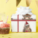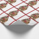 Ist hier ein Spaß-Packpapier, zum zu helfen, Ihre Geschenke zu verzieren dieses Weihnachten. Dieses glatte Papier kennzeichnet eine Fotografie eines niedlichen lächelnden Eichhörnchens, das eine helle rote Weihnachtsmannmütze trägt und eine Zuckerstange mit einem roten Bogen auf ihm hält.