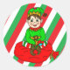 Rot, grün und weiß gestreiftes festliches Aufkleber mit einem hübschen, von der Hand gezogenen Cartoon-Elf, der auf der Spielzeugtasche des Weihnachtsmanns lächelnd sitzt.