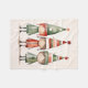 Drei bezaubernde Weihnachtselfen in festlich-grünen und roten Outfits, jede mit einzigartigen hohen Hüten mit Sternen, Streifen und Wintermustern dekoriert. Ihr niedlicher und minimalistischer Stil erweckt den Urlaubssinn auf angenehme Weise.