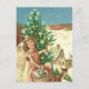 Vintage Illustration eines Weihnachtsengels mit einem Reh, der Spielzeuge in ein schneeweihnachtliches Dorf bringt.