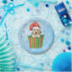 Feiern Sie die Urlaubssaison mit einem niedlichen englischen Setter-Welpe, die eine Weihnachtsmannmütze in einer hellen Geschenkboxen trägt, umgeben von Schneeflocken und mit den Worten, Happy Howlidays!