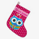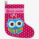 Niedliche kleine Eule, die in der Hand Weihnachtsgeschenk hält. Sie können mit Ihrem Namen personifizieren oder Hintergrundfarbe ändern