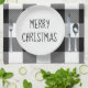 Fröhlicher Weihnachtstext auf einem runden weißen Teller und Silbergeschirr mit kariertem, weißem und schwarzem Büffel. Text kann bearbeitet werden.