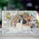 Frische Gold- und Silberbaumdekorationen, umgeben von salzgrünem, festlichem Blattwerk, mit frisch gefallenem Schnee in einem Winterwunderland, für Ihren Weihnachtsfeiertag.