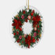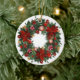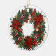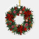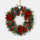 Eine digitale Kunstillustrierung eines Weihnachtsschmucks mit einem Kranzdesign. Der Kranz besteht aus grünen Kiefernästen, roten Poinsettien, roten Beeren, goldenen Beeren und rot-weiß gestreiften Bonbons. Das Ornament ist rund und weiß, mit einer goldenen Kette an der Spitze zum Aufhängen. Der Hintergrund ist schlicht weiß. Der Stil erinnert an klassische Weihnachtsdekorationen mit einer modernen digitalen Drehung. Die Farbpalette wird von Rot, Grüntöne und Gold dominiert und schafft eine festliche und warme Atmosphäre.