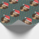 Braune Hautschönheit mit natürlichen Haaren trägt eine rote Weihnachtsmannmütze über sich. Sie ist auf einem dunklen, aquamarinen Hintergrund mit braunen Polka-Punkten. Perfektes Verpackungspapier für dieses besondere Geschenk und Person.