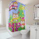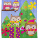 Der Duschvorhang ist in einem Gradientenblau gehalten, mit kleinen, weichen Schneeflocken, verzierten Weihnachtsbäumen, bunten Geschenken und vier Eulen in farbenfrohen Hüten und Schals!