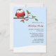 Eine schöne Cartoon-Illustration einer niedlichen braunen Eule, die einen roten Schal trägt, der auf einem Baum auf einem blauen Schneeuntergrund steht.