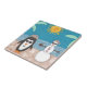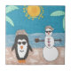 Ein Schneemann und ein Pinguin nehmen einen Urlaub am Strand.