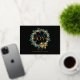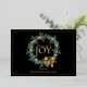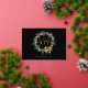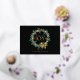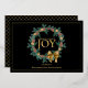 "Wishing You a Season of Joy" Weihnachts-Kiefernreath mit goldenem Tönbogen, pinecones und goldgelben Töne gepufften Look Sterne grüßen Design auf einem schwarzen Hintergrund. Alle Texte können nach Belieben geändert werden. Vorderer Text und rechteckiger Rahmen sind in realer Folie. Auf der Rückseite befindet sich ein goldfarbenes, diagonales Rastermuster auf schwarzem Hintergrund. Composite Design von Holiday Hearts Designs (Rechte vorbehalten).