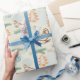 Braune Taubenabbildungen auf einem nahtlosen Muster beigen Hintergrunds. Grüner Weihnachtsbaum mit aufgehängten Ornamenten. Glocken und Schneeflocken füllen dieses schöne Urlaubsmuster.