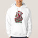 "Feierliche Weihnachtsfeier. Dieses lebhafte Hoodie-Design besticht durch einen fröhlichen Weihnachtsmann in seinem klassischen roten Anzug und Hut mit einem festlichen Weihnachtsbaum, der mit Ziergegenständen und Lichtern geschmückt ist. Die zentrale Nachricht lautet "Merry Harry Mars Weihnachten", umgeben von urbanen Themen wie Kiefernästen, roten Ornamenten und einem Banner im Bannerstil. Das Design strahlt den Urlaubssgeist mit seinen kühnen, hellen Farben und spielerischer Typografie aus und macht es zu einer perfekten festlichen Wahl, um Weihnachtsjubeln zu verbreiten.