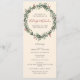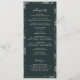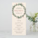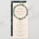 Feiern Sie Ihre Winterhochzeit mit diesen festlichen Weihnachtsprogrammen! Mit einem Aquarellkranz mit heiligen Beeren auf einem weichen pfirsichfarbenen Hintergrund, der Ihre Namen anzeigt. Ihre Hochzeitsdetails werden in einfacher und moderner Typografie dargestellt. Diese Einladung kehrt zu einem dunkelgrünen Hintergrund zurück, der die Vorderseite mit einem Muster von handgezeichnet Schneeflocken um die Kanten kontrastiert.