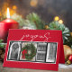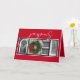 Diese festliche Grußkarte enthält einen roten Hintergrund, weiße Skripttext, der lautet: "fröhlich" und Fotos, die das Wort "Weihnachten" erstellen. Das Wort "Weihnachten" besteht aus schwarz-weißen Fotos zusammen mit einem farbigen Foto eines Weihnachtsschadens, das den Buchstaben "o" in "Weihnachten" liefert.