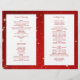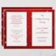 Weihnachten, Feiertag, Hochzeitsvorstellung mit Vorlagen für eine katholische Kirchenfeier. Roter, funkelnder Sternenhimmel mit weißen Tafeln, die die Vorlagen des roten Texts enthalten. Dadurch entsteht auf beiden Seiten des Papiers eine Schichtenbildung. Moderner, handgeschriebener Schriftart wird für Titel, Namen und Nachrichten auf der Rückseite verwendet, der übrige Text befindet sich im gedruckten Schriftart. Die letzte Seite (Rückseite des Programms, wenn gefaltet) enthält einen Abschnitt für die Schrift (Beispiel ist "Liebe ist geduldig, Liebe ist freundlich" von 1 Korinther) und eine Nachricht von der Braut und Bräutigam.