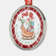 Dieses wunderschöne Ornament, hat einen roten karierten Hintergrund. In der Mitte ist ein Bild vom Weihnachtsmann, in seinem Schlitten. Es gibt bunte Geschenke und einen Weihnachtsbaum. Der Text auf der Vorderseite liest frohe Weihnachten.