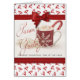 Schönes und sanftes Rentiermuster mit roten Weihnachtsbändern und einer heiß-Weihnachtsschokolade mit Marshmallows-Tasse. Die Jahreszeit"s Grüße Kalligraphie Skript und anpassbare kurze Text, die schönste Zeit des Jahres. Personalisieren Sie das Foto und den Text. Gute Ferien!