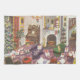Vintage Illustration Frohe Weihnachtsgestaltung mit dem Inneren eines Wohnzimmers mit einem Spiegel über dem Kamin, Möbeln und einem Kronleuchter. Dieses gemütliche Zimmer ist mit Geschenken, Packpapier und Band an Heiligabend übersät. Eine niedliche Kätzin schläft auf einem Ottoman.