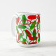 Diese Tasse hat ein Bauhaus-Design von Ovalen und ovalen Konturen in rot und grün.