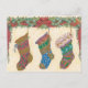 Schöner Jahrgang Weihnachten Strumpf Postkarte. Dieses Design besteht aus drei dekorativen Strümpfen mit einer heiligen Garage.