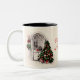 Weihnachten Tasse mit einer Vintagen Szene eines Weihnachtsbaumes vor einem Fenster, das nachts von Kerzenlicht erhellt wird. Personalisieren Sie Text, mehr Größen und Farben verfügbar!