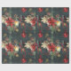 Ein festliches und luxuriöses Verpackungspapier mit grünem Waldhintergrund, geschmückt mit schimmernden goldenen Schneeflocken, Poinsettias, Laternen und Kiefernbällen mit einem strahlenden roten Ball-Ornament auf rotem Band fällt.