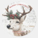 Dieser Weihnachtsaufkleber zeigt eine rustikale Abbildung eines Hirsches, der mit einem Kiefer- und Rotweinkranz an seinen Geweihen geschmückt ist. Der Hintergrund hat einen Vintagen, texturierten Stil mit handgeschriebenem Skript, und "Frohe Weihnachten" wird in fett rotem Text hervorgehoben. Es ist ideal, um Ihren saisonalen Gruß mit einem warmen, gemütlichen Urlaubscharm zu bereichern.