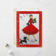 Eine wunderschöne und festliche Vintage inspirierte Karte. Die mittlere Abbildung zeigt eine Frau in einem roten Mantel, die an einem Wintertag ein Geschenk mit ihrem schwarzen Poodle trägt. Die rote Grenze ist mit weißen Goldschneeflocken übersät. Die Rückseite der Karte weist einen zarten Rahmen des gleichen weißen goldenen Schneeflockenmusters auf.