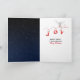 Weiße Taube mit Weihnachts-Freudenschmuck auf weißen Kiefern mit Schneeflocken.