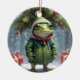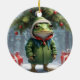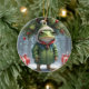 Ein hübscher kleiner Frosch in einem grünen Park mit weißem Pompom, der vor einem Weihnachtsbaum stehend ist.