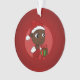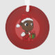 Design mit Illustration eines niedlich lächelnden afroamerikanischen Babys, das Kind trägt eine rot-weiße Kleidung mit dem Hut des Weihnachtsmanns und hält ein Geschenk; Weihnachtsferien-Design für Kinder auf rotem Hintergrund Um mehr meine Zeichentrickfiguren zu sehen, besuchen Sie bitte mein Geschäft