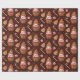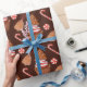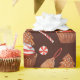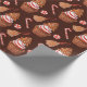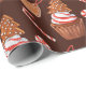 Unser schmuckloses Weihnachtskuchen Keksbrot Cupcake Wrapping Paper enthält Aquarellabbildungen von Schokoladenkuchen mit Zuckerguss aus rotem und weißem Streifen, überzogen mit Gingerbrot-Keks-Weihnachtsbaum und umgeben von roten und weißen Pfefferminzbonbons auf dunkelschokoladenbraunem Hintergrund.