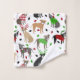 Niedliche Pitbull-Hunde mit schwarzen, braunen, blauen und roten Fellfarben in festlichen Outfits, Weihnachtsmannmützen und Raute-Pullover mit verstreuten Weihnachtsschmuckmustern.