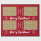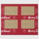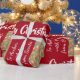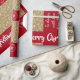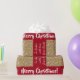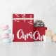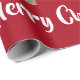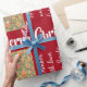 Moderne Weihnachtsgeschenkpackung für Kinder mit den Worten "Frohe Weihnachten" in stilvoller Typografie, eine personalisierte Hingabe, die jetzt "To Amber / with Liebe / from Santa" liest, Schneeflocken, und ein Muster mit Rentieren, Weihnachtsbäumen, Baubles, Schneeflocken, Schneemännern, Lebkuchenmännern, Strümpfen und Geschenkboxen. Auf einem roten Hintergrund.