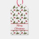Desteis ursprüngliches festliches Muster von grün und rot Weihnachten Heilige / Heilige Pflanze gemein mit roten Bögen. Es gibt auch einen personalisierbaren Textbereich, der jetzt lautet: "Frohe Weihnachten". Auf der anderen Seite befindet sich ein "von und nach"-Textfeld.
