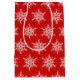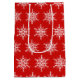 Diese Weihnachtsgeschenktasche wird in einem festlichen rot-weißen Schneeflockenprint gezeigt. Passen Sie dieses Objekt an oder kaufen Sie, wie es ist. Bild