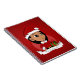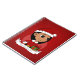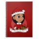 Design mit einer Illustration eines niedlich lächelnden, glücklichen Mädchens mit langen braunen Haaren, trägt sie ein rot-weißes Weihnachtskostüm und hält ein Geschenk; mit bearbeitbarem Textvorlage für Ihren Namen oder Ihre Nachricht, Weihnachtsfeiertagsdesign mit rotem Hintergrund