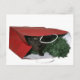 Schwarze Rauchkitty in einem roten Weihnachtsbeutel Fotokarte. Die Katze könnte jemandes Weihnachtsgeschenk sein oder einfach nur in jemandes Weihnachtsgeschenk Foto Weihnachtspostkarte