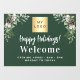 Grüner Hintergrund, weißer Text. Personalisieren Sie Ihr Logo und fügen Sie es hinzu. Text: Herzlichen Glückwunsch zu Feiertagen! Dekoriert mit Kiefernspießen und Kegeln.