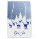 Geschenktasche mit Schneeszene, Weihnachtsstern und blauem Hirsch/Elch, die auf den Baum blicken und im Hintergrund abstürzen. Bild vorne und hinten. Text von Gott Jul unten. Farbszene blau und weiß. Kaufen Sie als entworfen oder nach Ihren Wünschen. Archivbild mit freundlicher Genehmigung von www.freepik.com