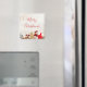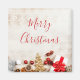 Ein Magnet mit einem rustikalen Foto. Ein hellbraunes Holzbrett mit verschiedenen Weihnachtselementen am Boden.