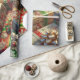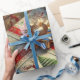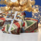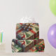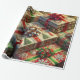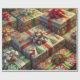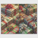 Die Szene zeigt eine Anordnung von Weihnachtsfeierlichkeiten, die in atemberaubender, festlicher Zeitung verpackt sind. Das Verpackungspapier zeichnet sich durch komplexe Designs aus, wie Schneeflocken, heilige Blätter, Bonbons und Weihnachtsbäume, die in lebendigen Urlaubstönen wie Rot, Grün, Gold und Weiß gehalten werden. Jede Schachtel strahlt glänzend oder metallisch aus und reflektiert sanftes, warmes Licht, um seinen festlichen Reiz zu erhöhen. Die Geschenke sind elegant mit luxuriösen Bändern und Bögen verbunden, die das Packpapier ergänzen oder ergänzen. Der Hintergrund vermittelt eine gemütliche Urlaubsatmosphäre mit warmen Lichtern, einem Weihnachtsbaum und saisonalen Dekorationen, die den Charme noch verstärken.