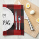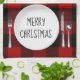 Fröhlicher Weihnachtstext auf einem runden weißen Teller und Silbergeschirr mit kariertem rotem und schwarzem Büffel. Text kann bearbeitet werden.