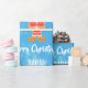 Moderne Weihnachtsgeschenkverpackung für Kinder mit einem minimalistischen Design, das eine Lebkuchenfigur des Weihnachtsmannes, Schneeflocken, den Gruß "Frohe Weihnachten" in stilvoller Typografie und einen personalisierten Namen beinhaltet. Auf blauem Hintergrund mit Schneeflocken.