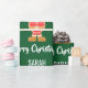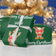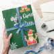 Moderne Weihnachtsgeschenkverpackung für Kinder mit einem minimalistischen Design, das eine Lebkuchenfigur des Weihnachtsmannes, Schneeflocken, den Gruß "Frohe Weihnachten" in stilvoller Typografie und einen personalisierten Namen beinhaltet. Auf einem grünen Hintergrund von Weihnachten.