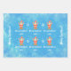 Moderne Weihnachtsgeschenkverpackung für Kinder mit einem minimalistischen Design, das eine Lebkuchenfigur des Weihnachtsmannes, Schneeflocken, den Gruß "Frohe Weihnachten" in stilvoller Typografie und einen personalisierten Namen beinhaltet. Auf blauem Hintergrund mit Schneeflocken.