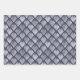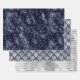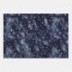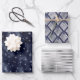 Dieses Sortiment aus verglasten Urlaubspapieren zeichnet sich durch ein silberfarbenes Imitat aus, das Schneeflocken auf einer Folie aus marineblau-blauen Imitaten zeigt; ein silberfarbenes Imitat-Deko-Fan-Muster auf marineblarem Hintergrund; und ein silberfarbenes Imitat-Streifenmuster.
